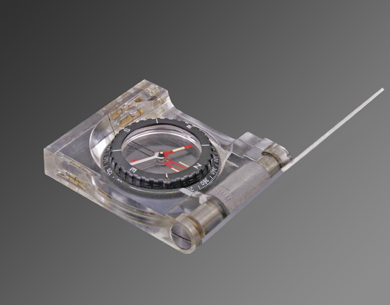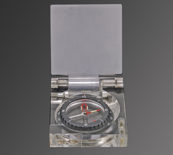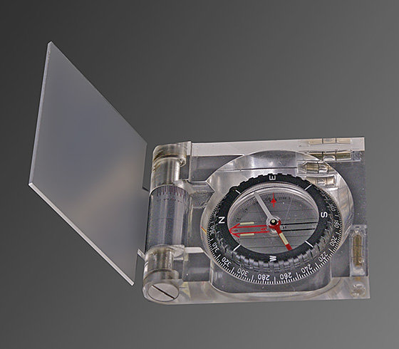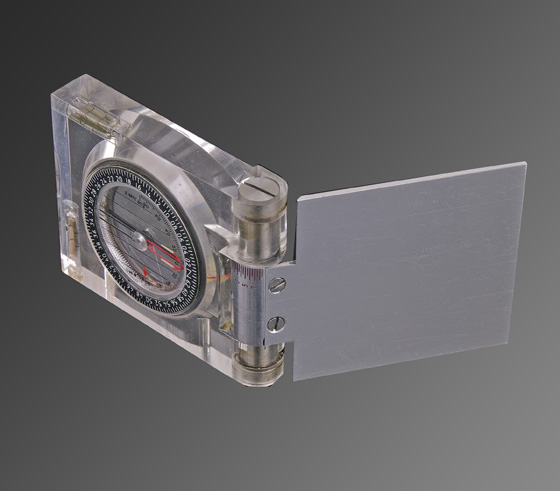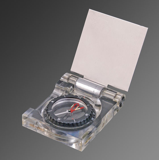 Clearly visible the opening on the left side of the compass. The thumb of the left hand rests on this, while the compass rose can be turned with the right hand.