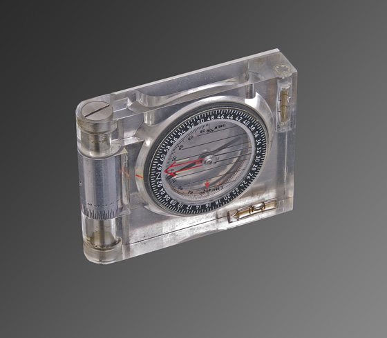 Front view of the VUA compass. Visible are the two cylindrical bubble spirit levels. These have a diameter of 6 mm and are sealed with a piece of PMA. The inclination scale is read on the inside of the compass.